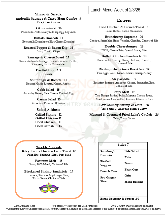 20% Gratuity will be added to all parties for Brunch